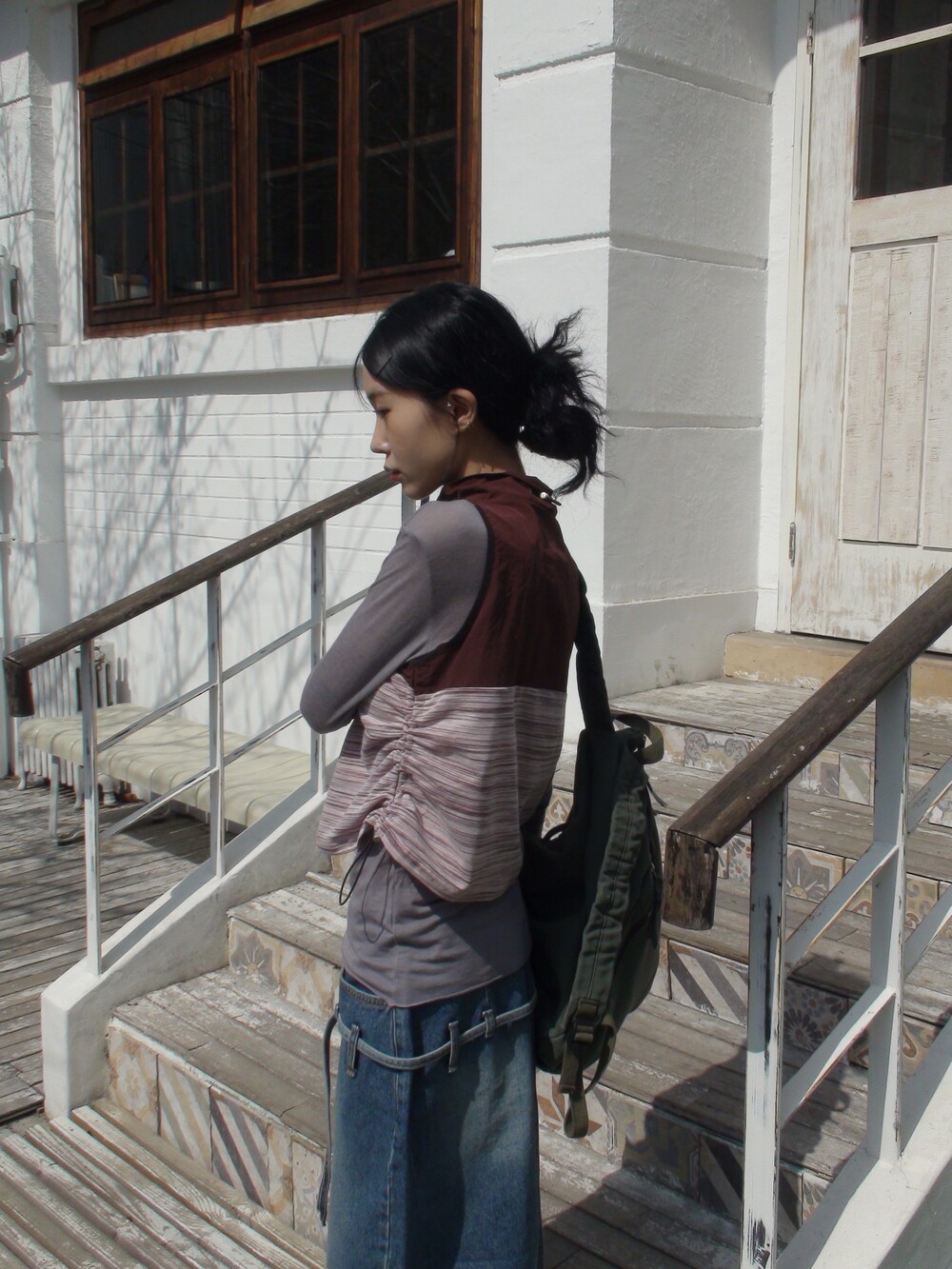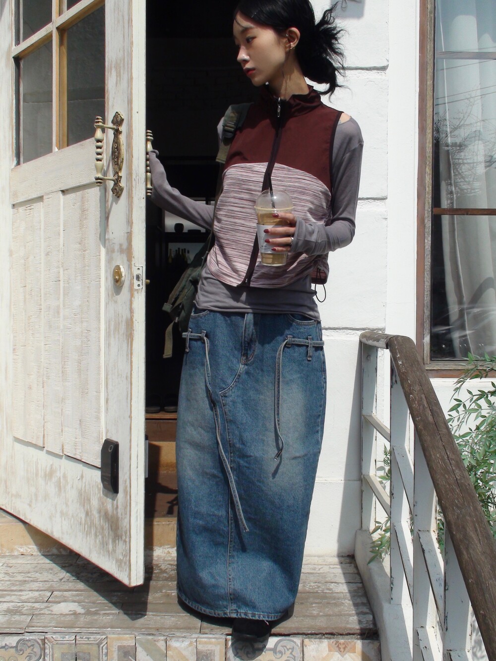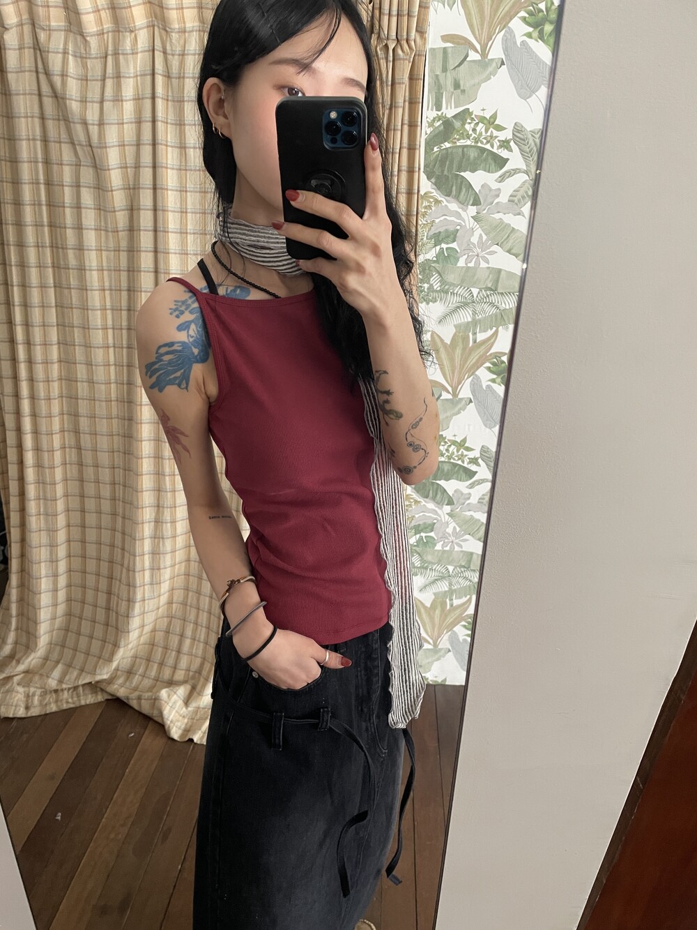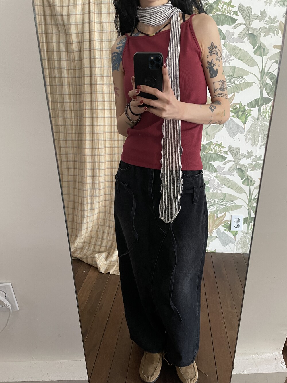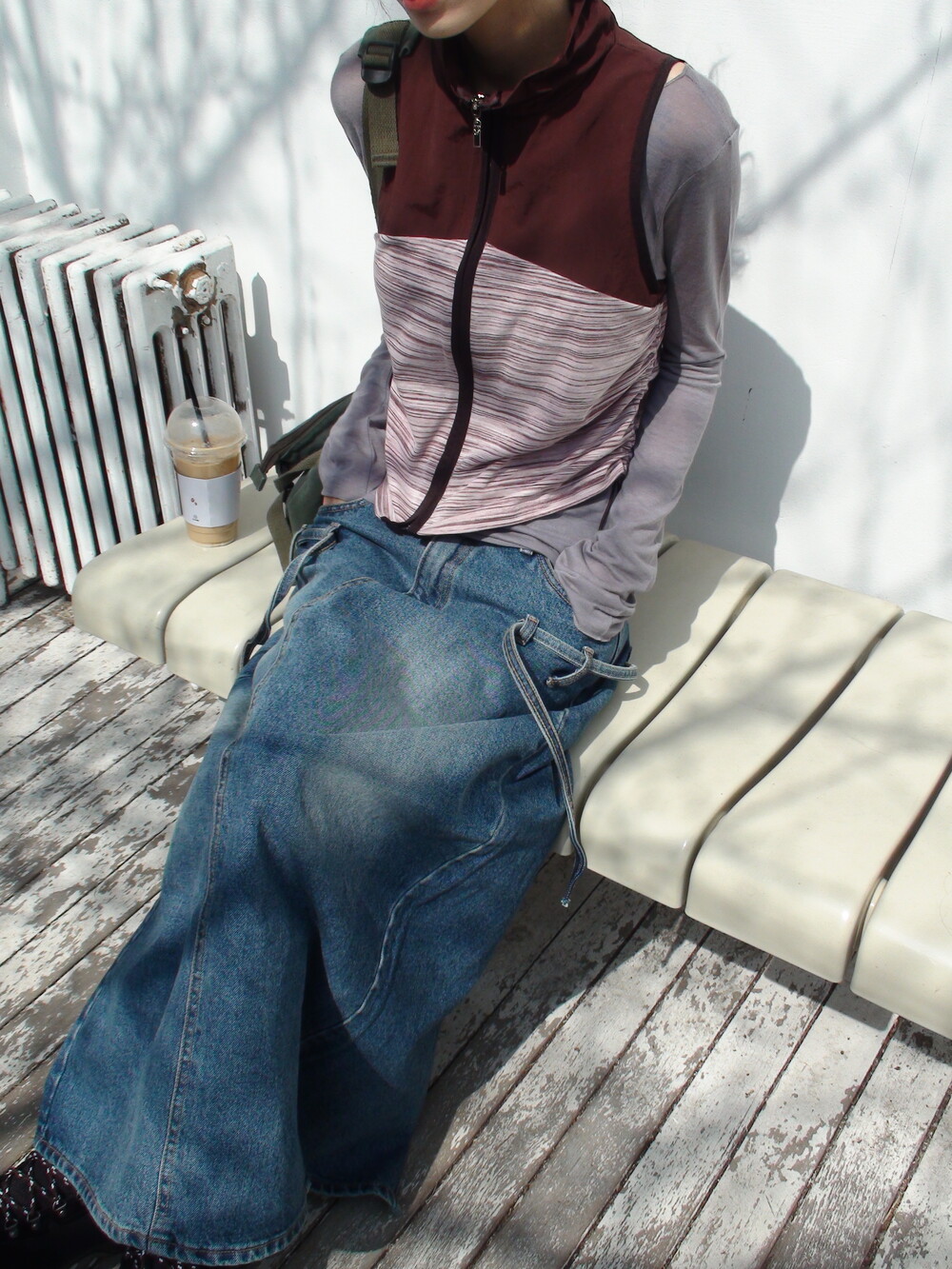 비교적 넉넉한 웨이스트라인으로 안정감있게 착용되어로우라이즈로 연출이 가능하며,
