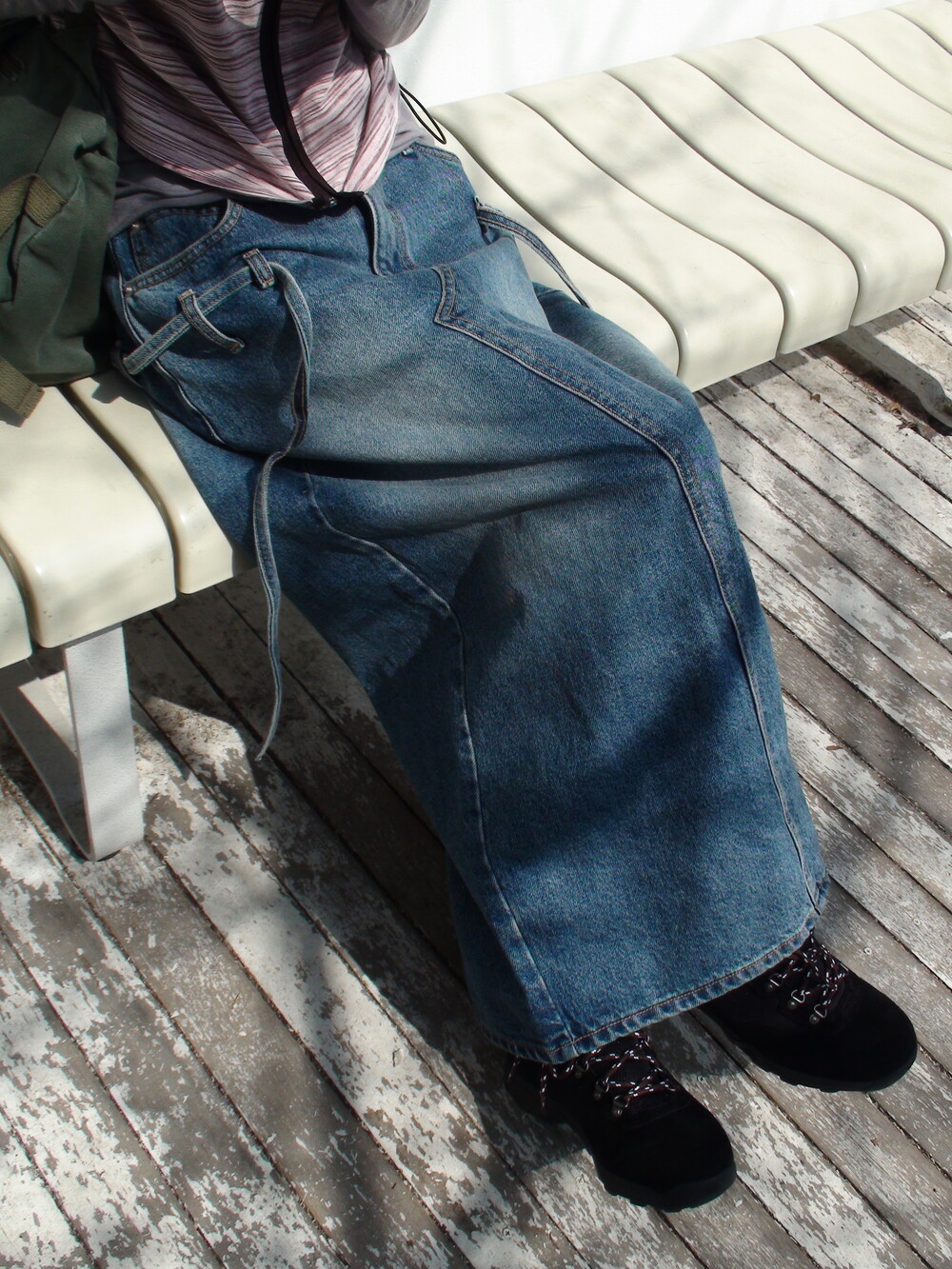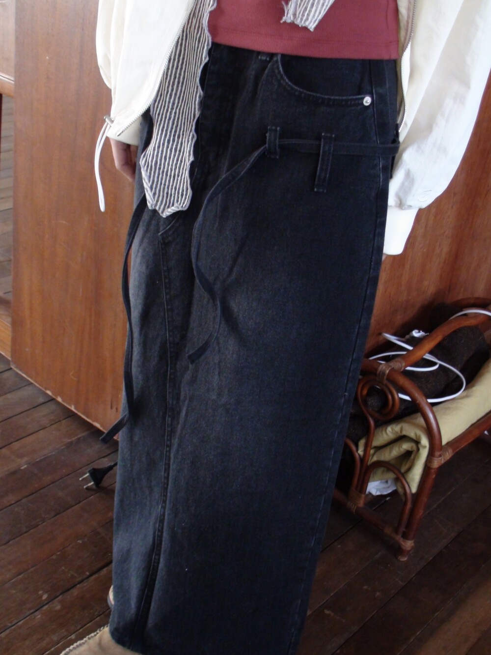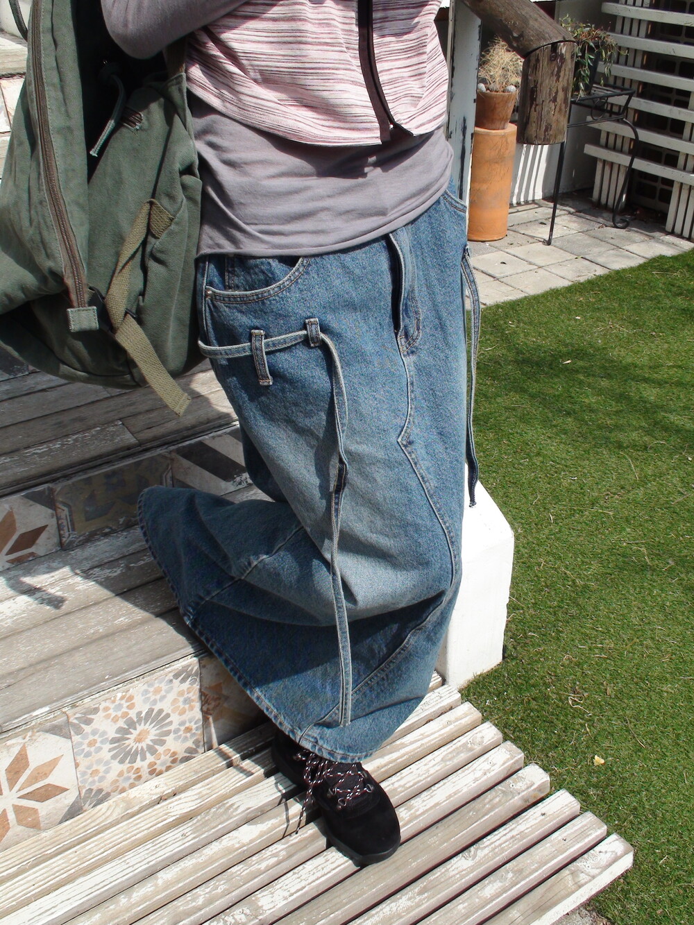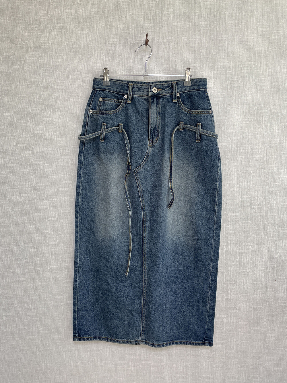 탄탄한 데님원단으로 제작되었으며, 기존에 벨트라인이 아닌 포켓 밑 부분에 스트랩끈을 디테일을 사용하여 디자인적인 면에서 유니크함이 돋보이는 제품입니다.