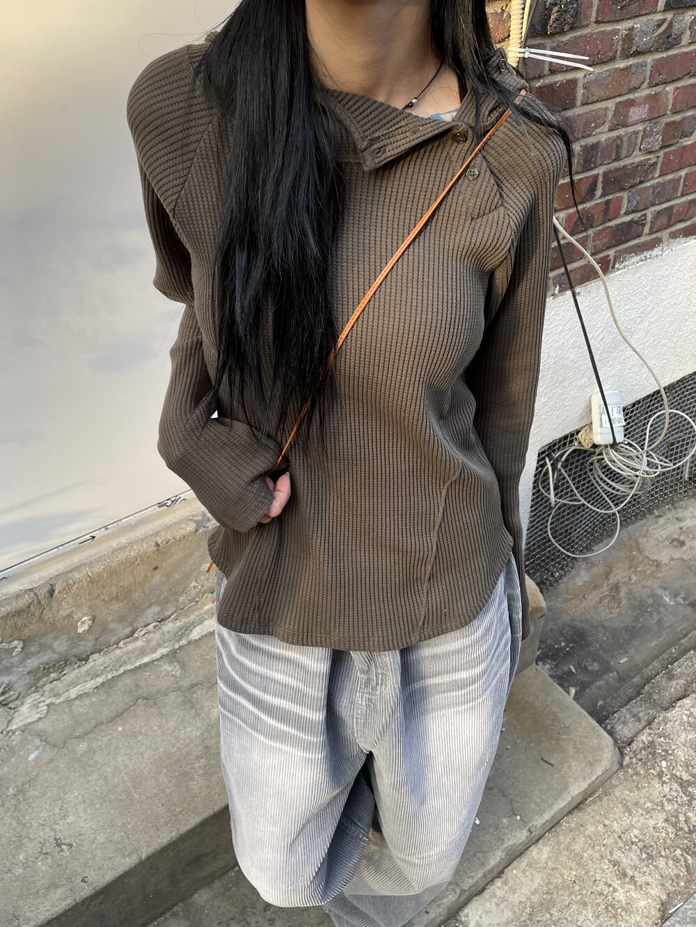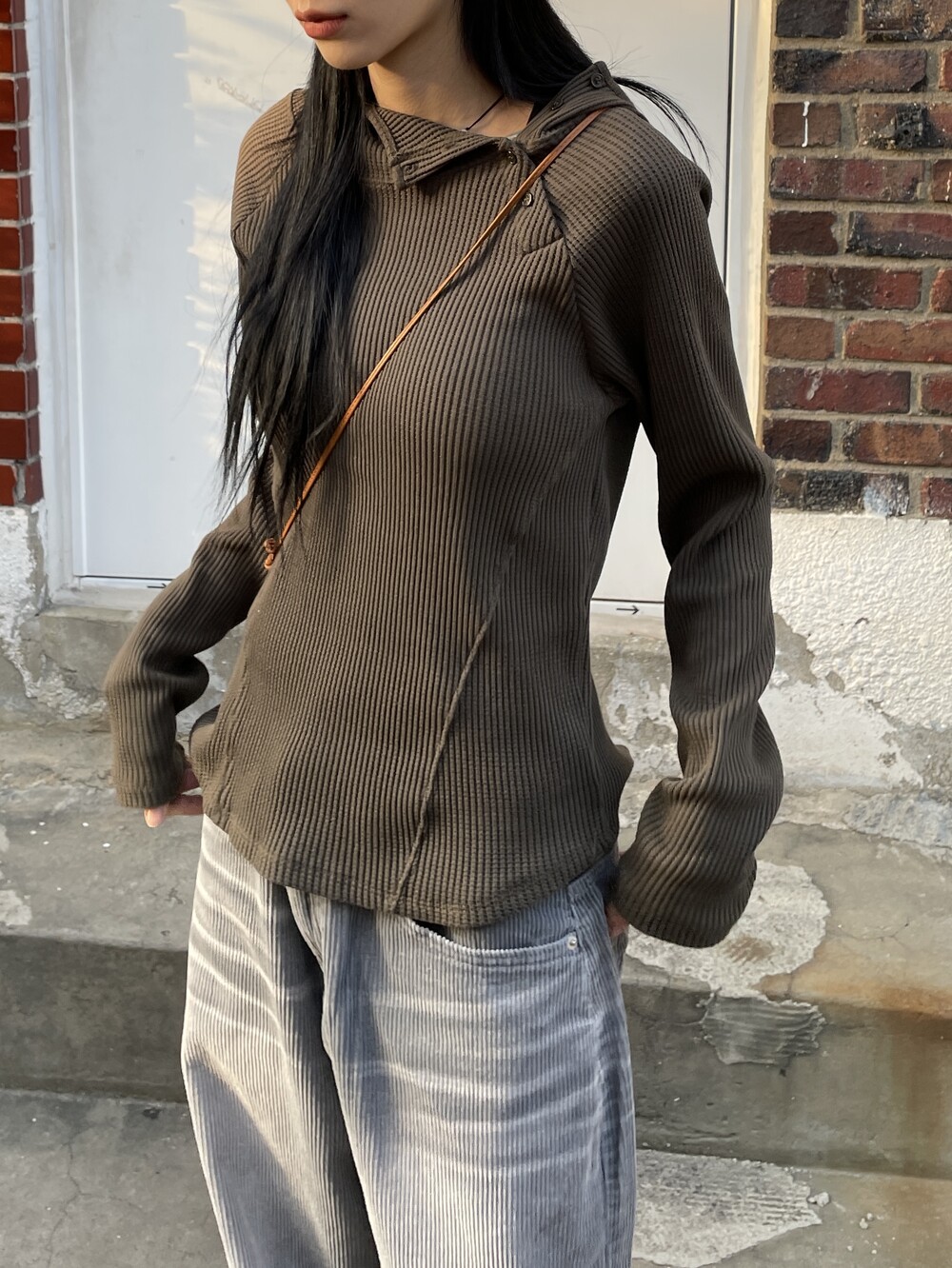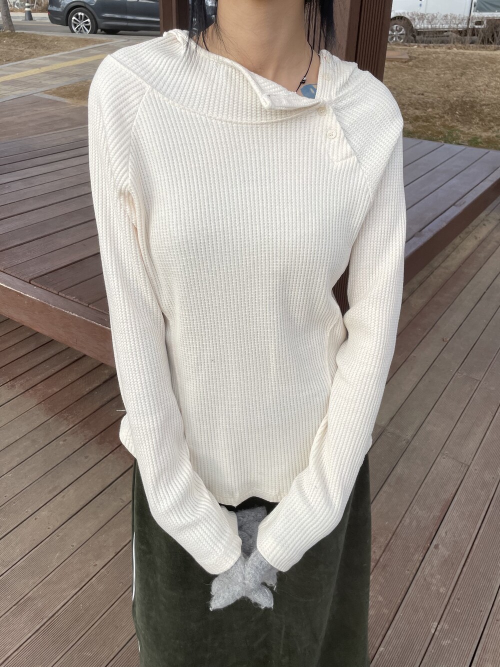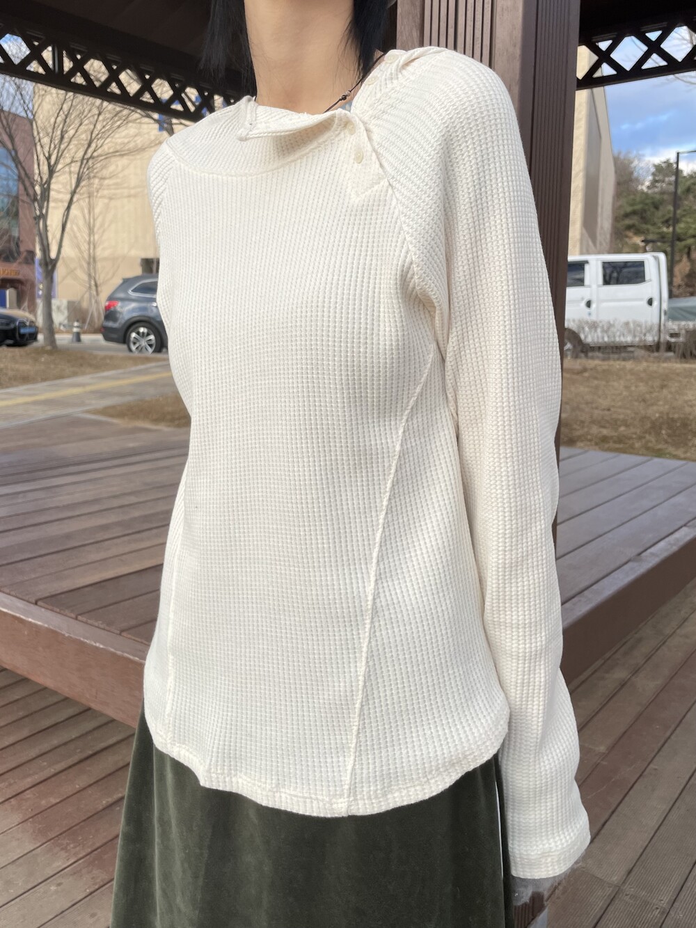 허리라인부터 밑단까지 내려오는 절개 디테일로 허리가 얇아보이는 시각적 효과를 주며, 와플소재감이 주는 특유의 빈티지한 무드로 코디의 완성도를 높여주는 제품입니다.