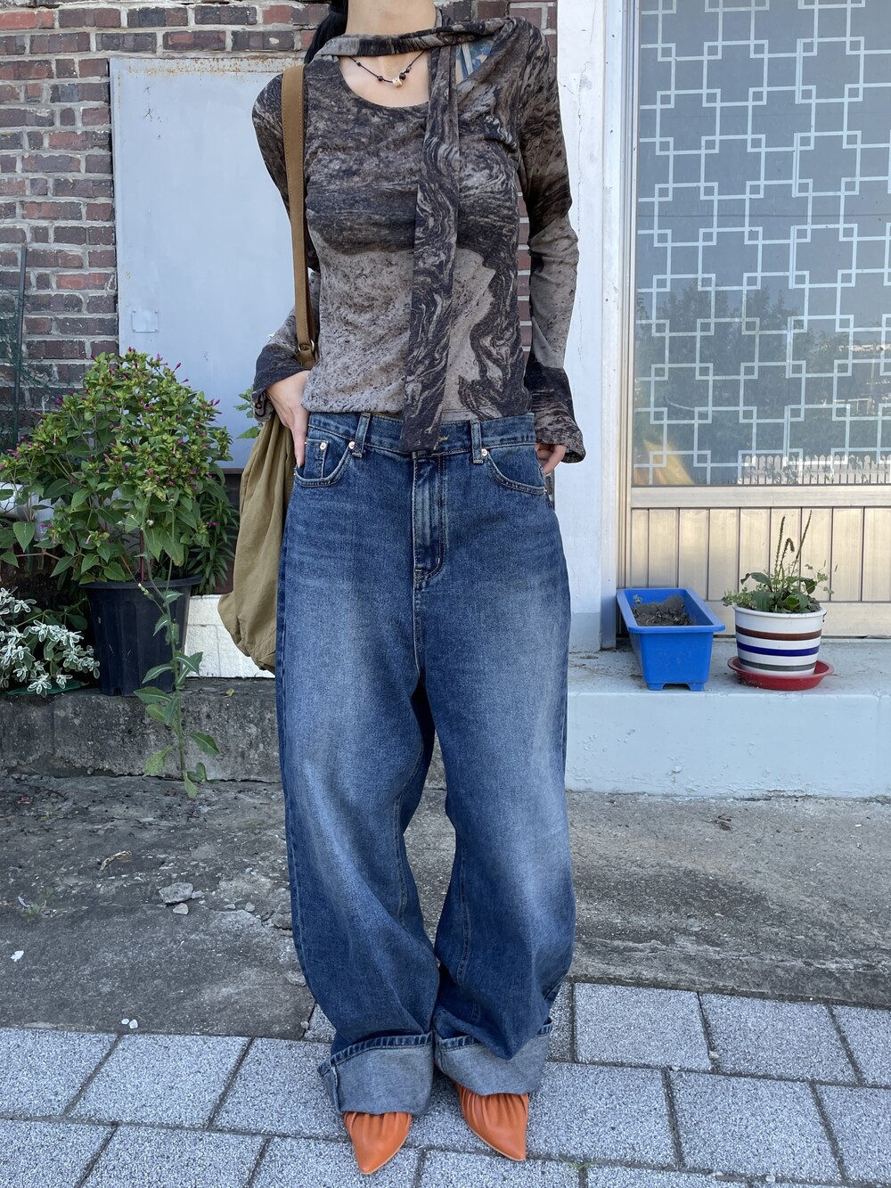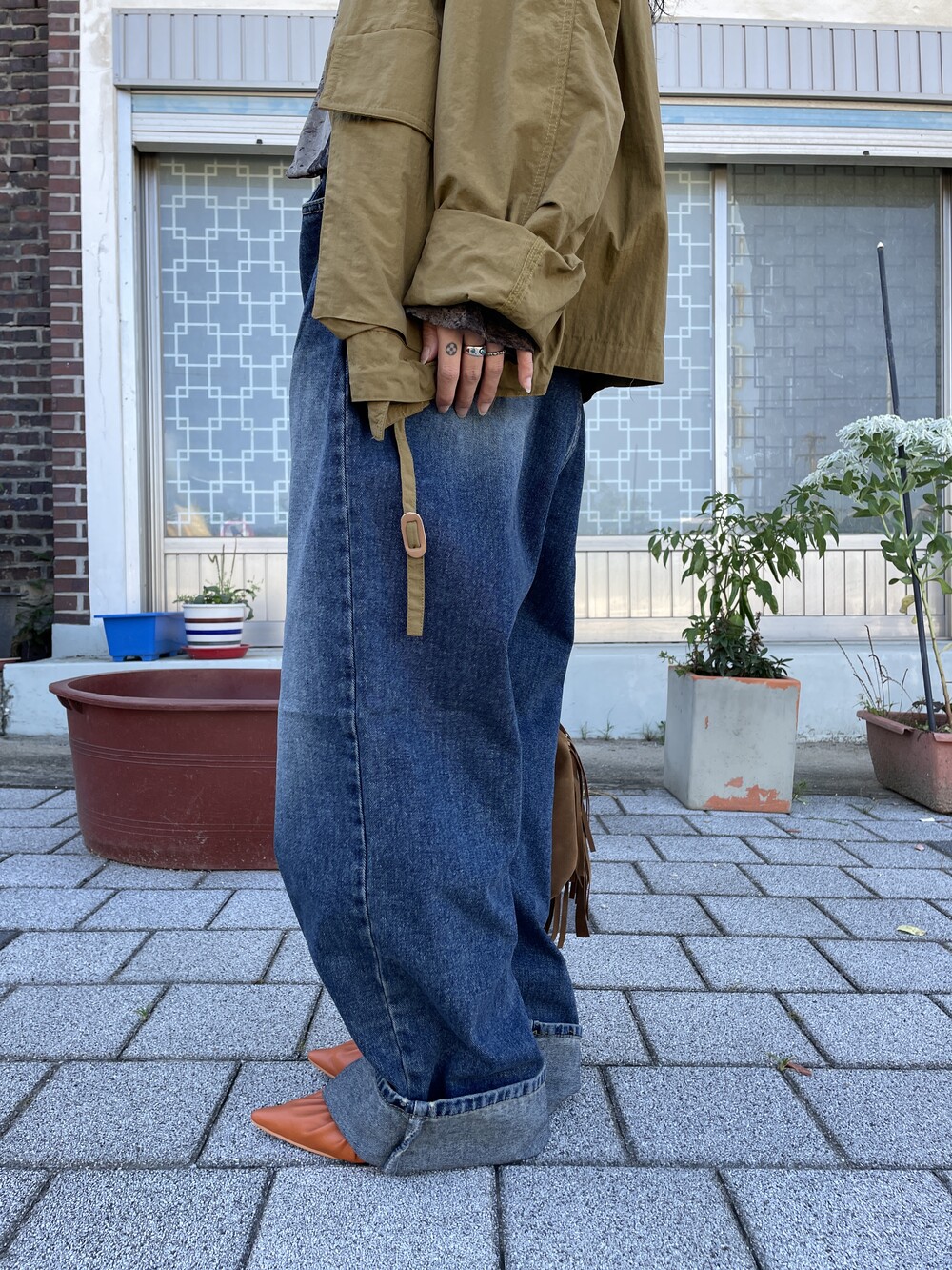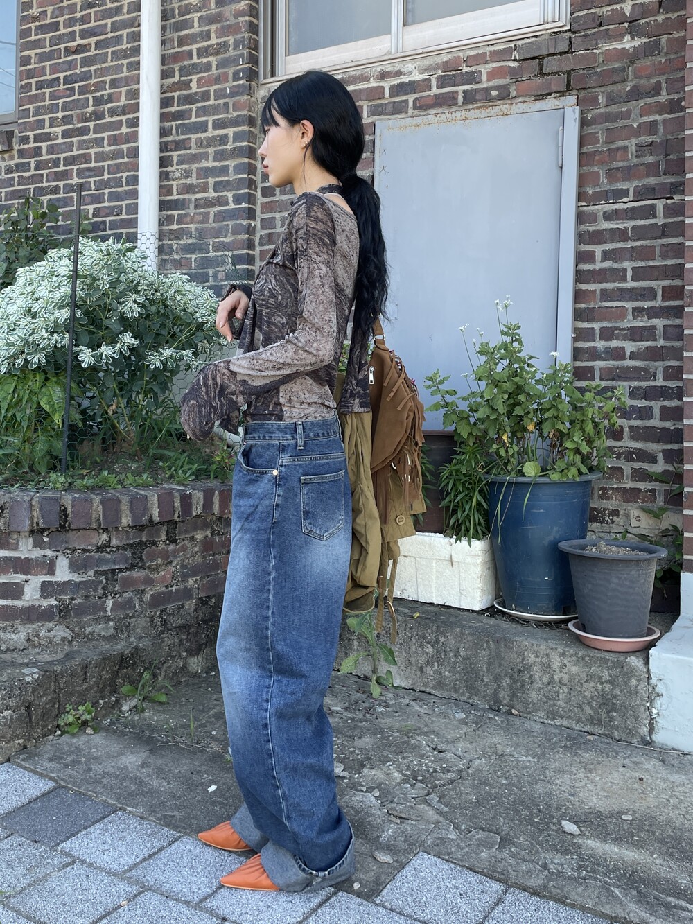 로우라이즈 핏감과 와이드하고 루즈하게 떨어지는 실루엣으로 매력적인 아웃핏을 선사하며,