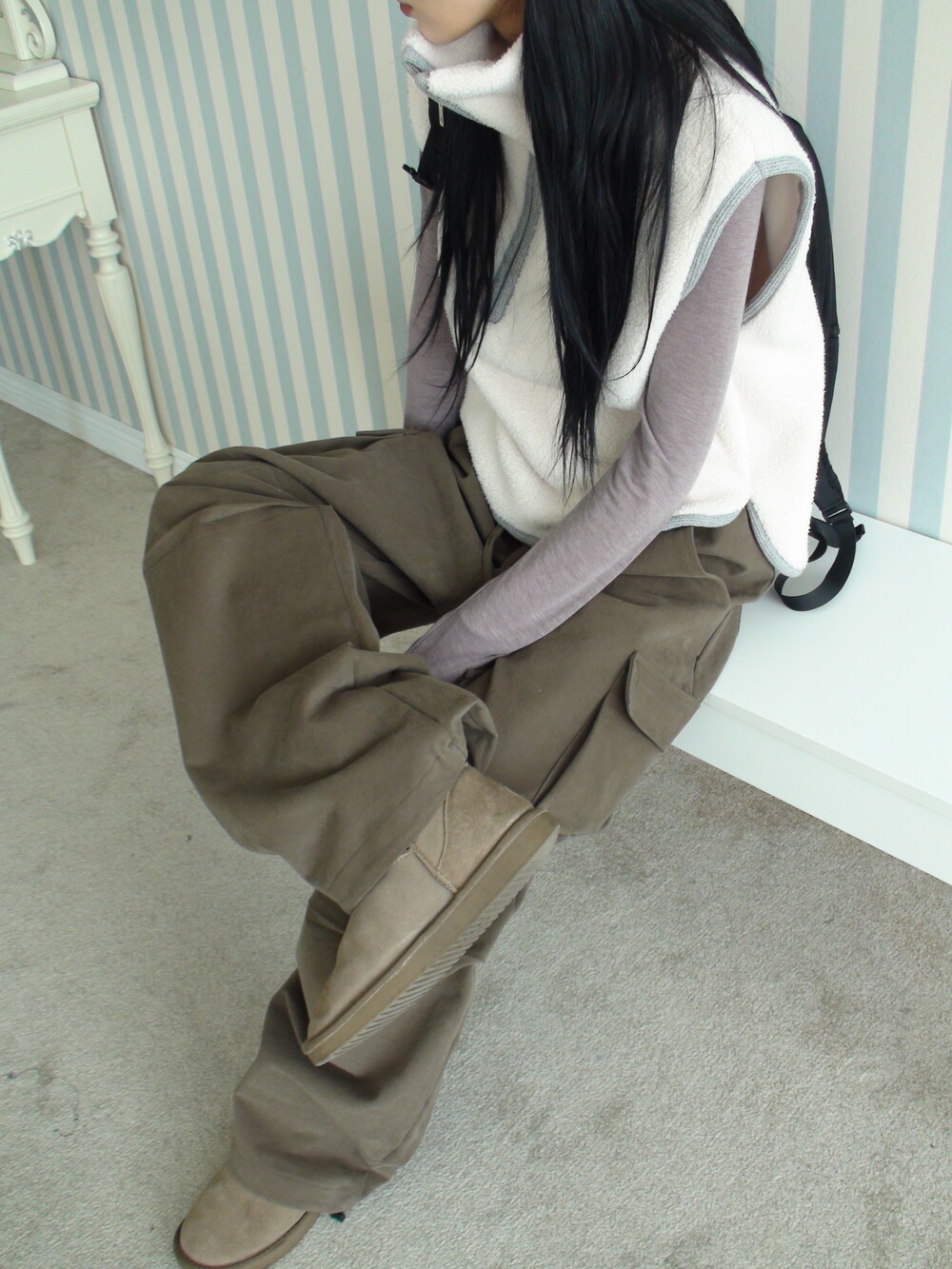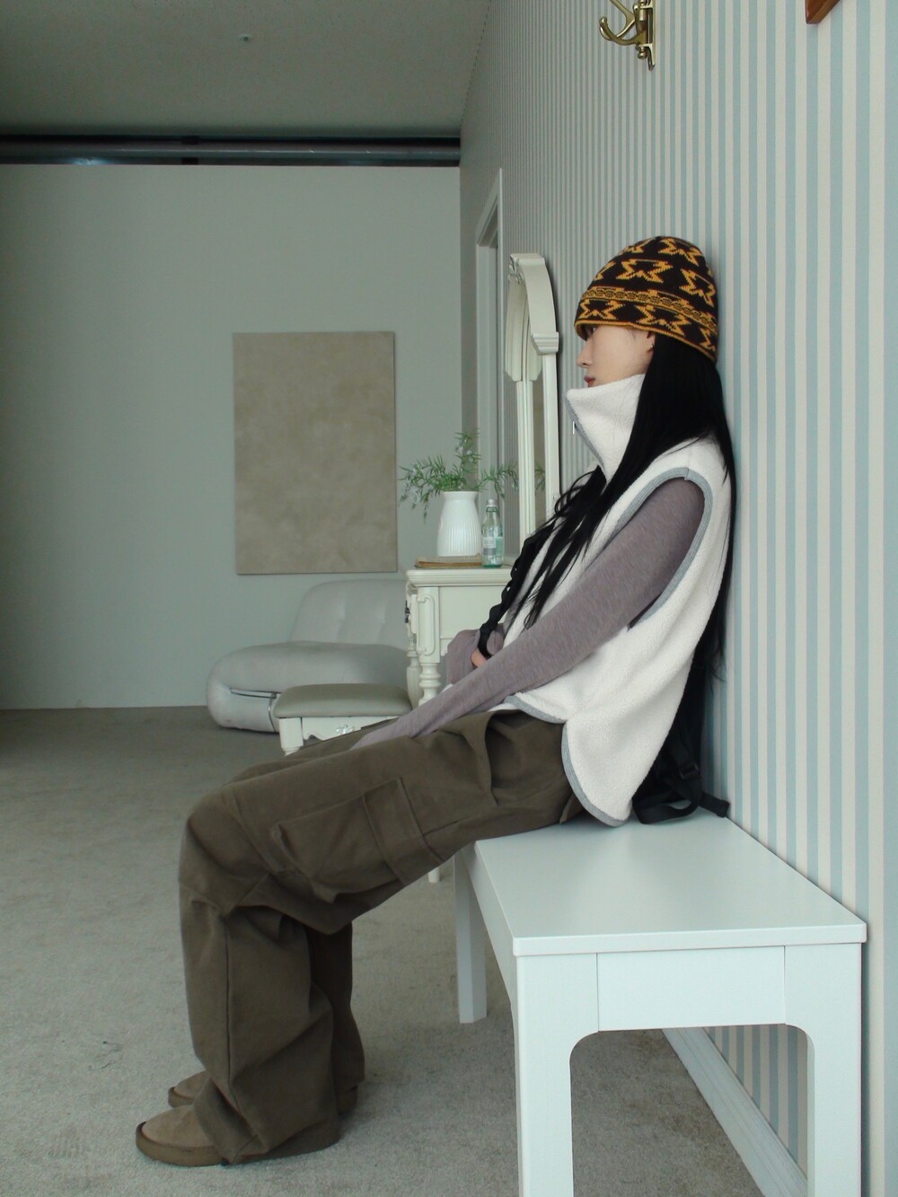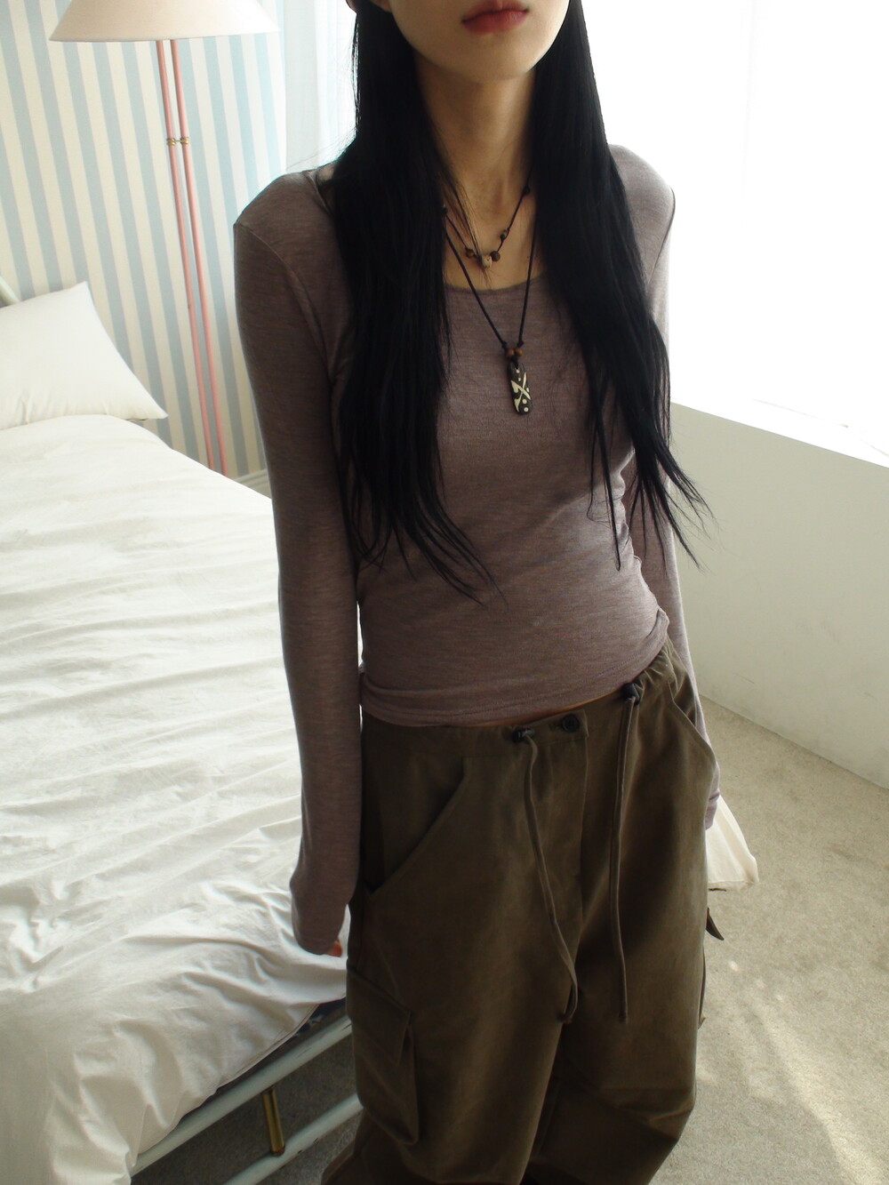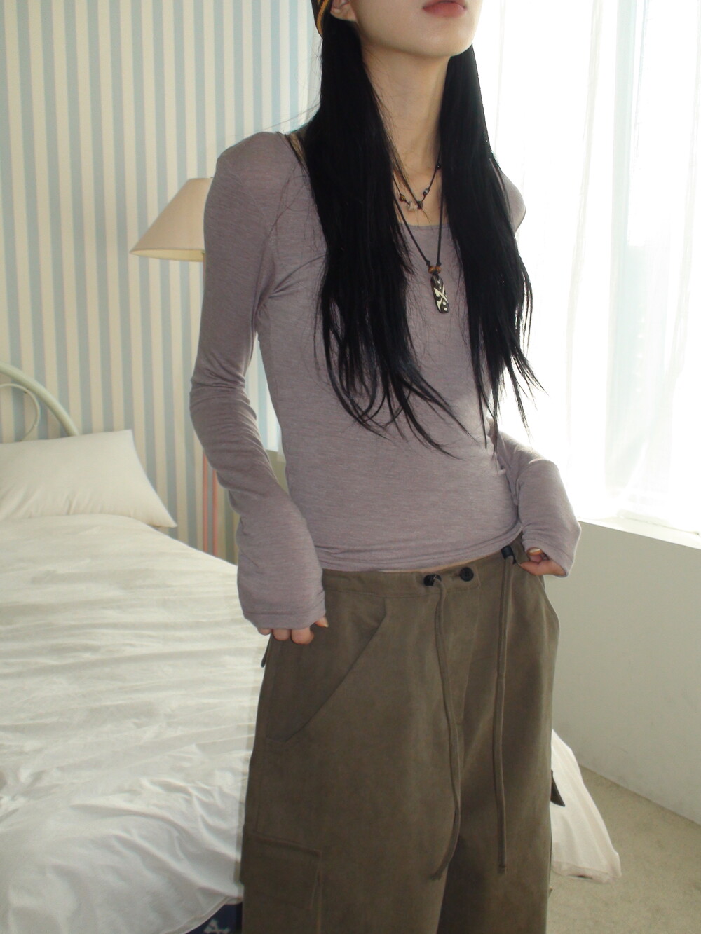 딥한 u넥 라인으로 목선과 쇄골라인을 여리하게 연출해주며, 슬림하고 롱하게 떨어지는 팔라인으로 페미닌한 실루엣을 보여줍니다.