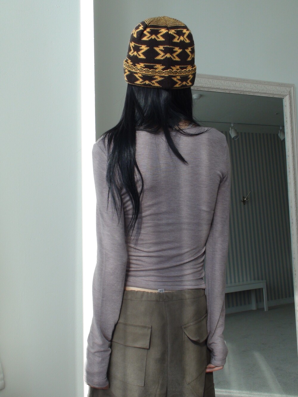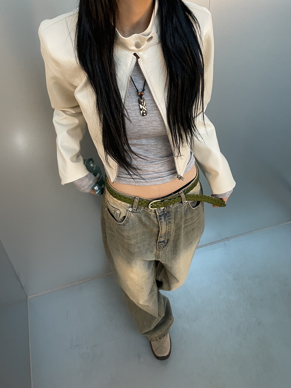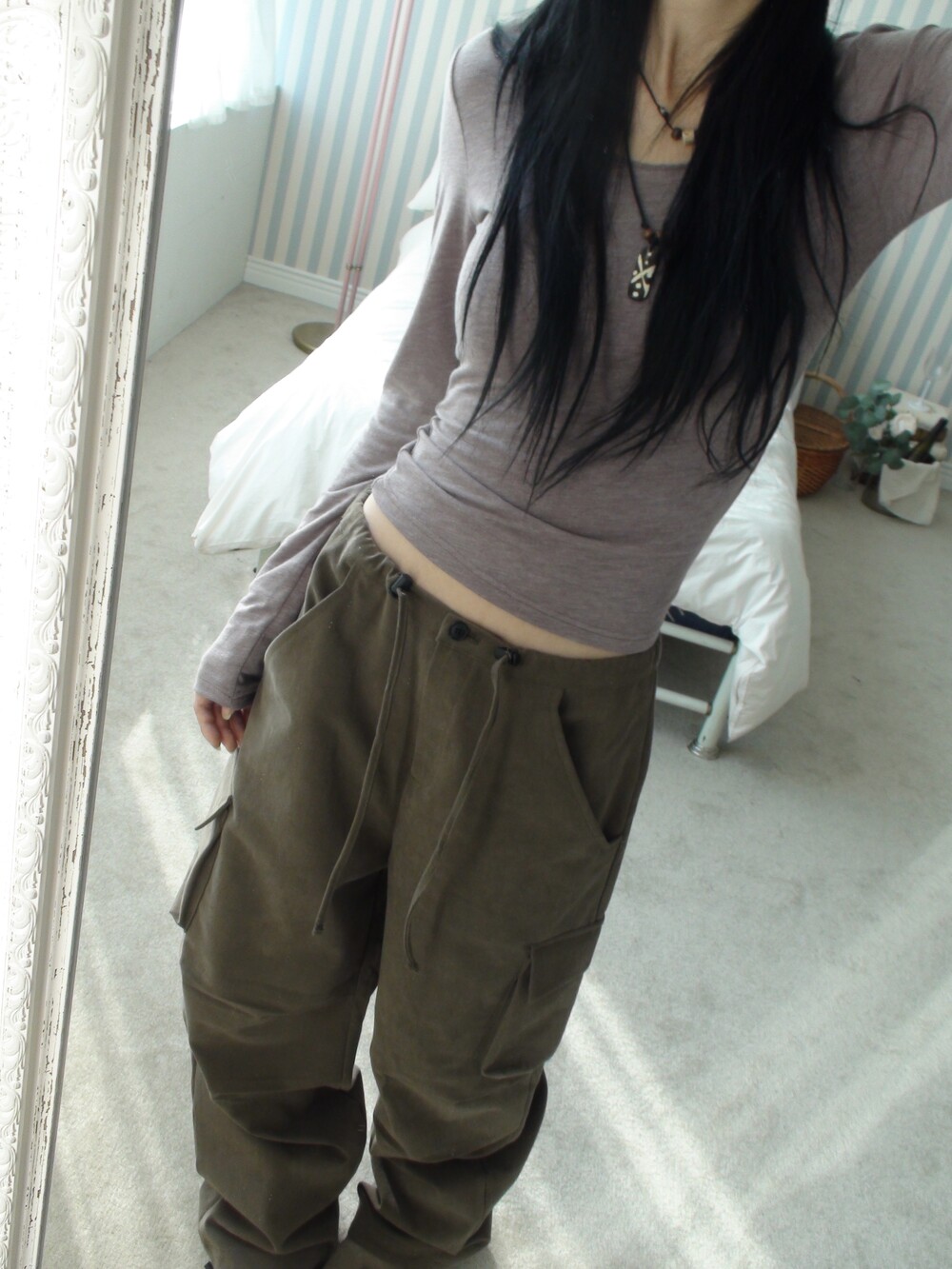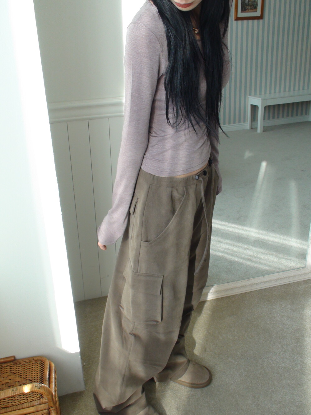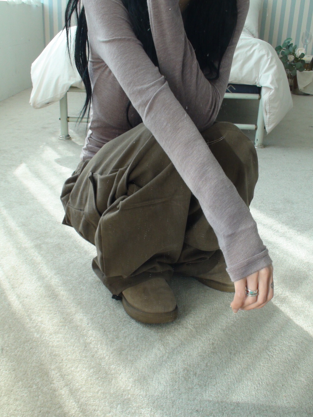 딥한 u넥 라인으로 목선과 쇄골라인을 여리하게 연출해주며, 슬림하고 롱하게 떨어지는 팔라인으로 페미닌한 실루엣을 보여줍니다.