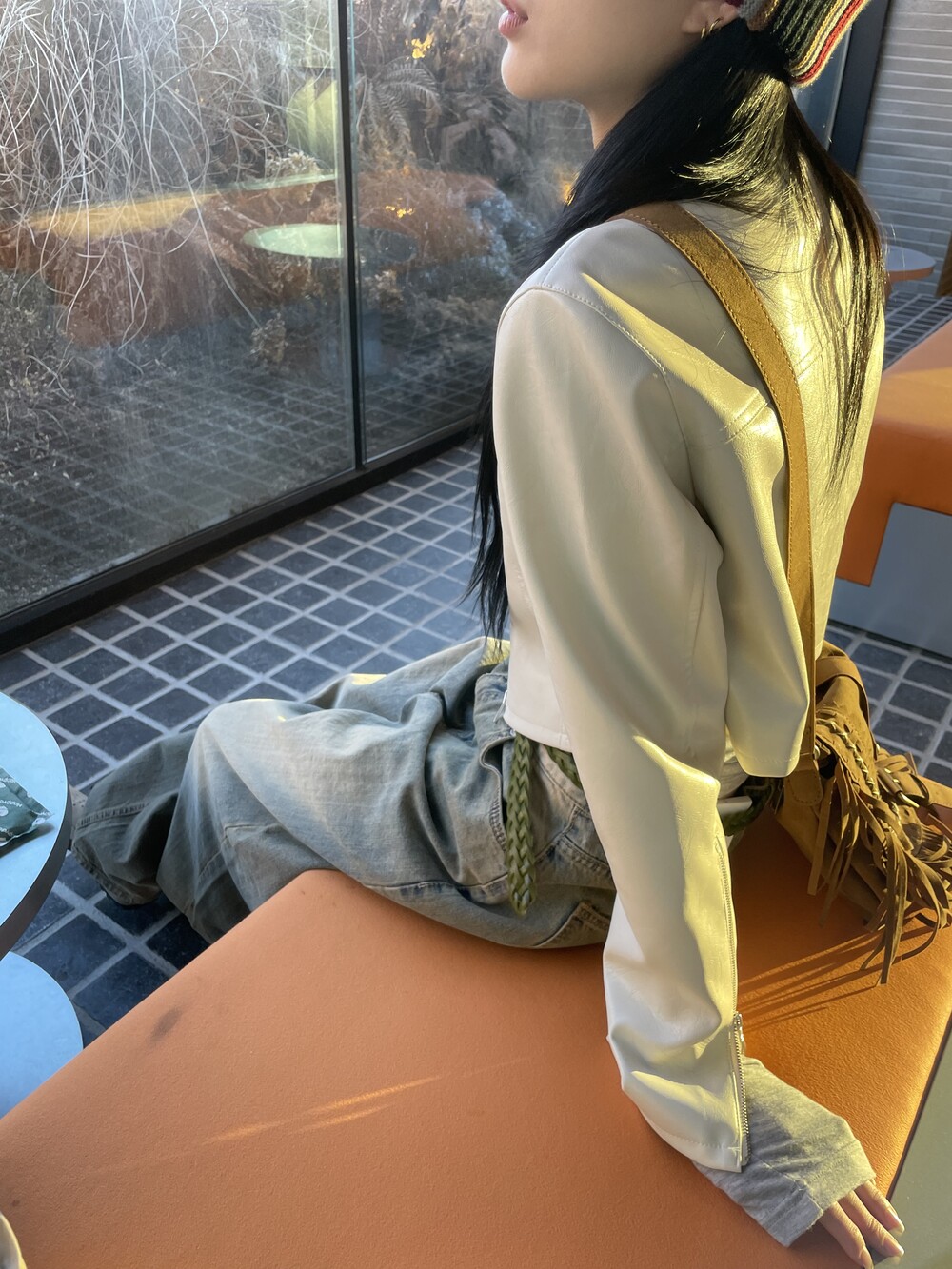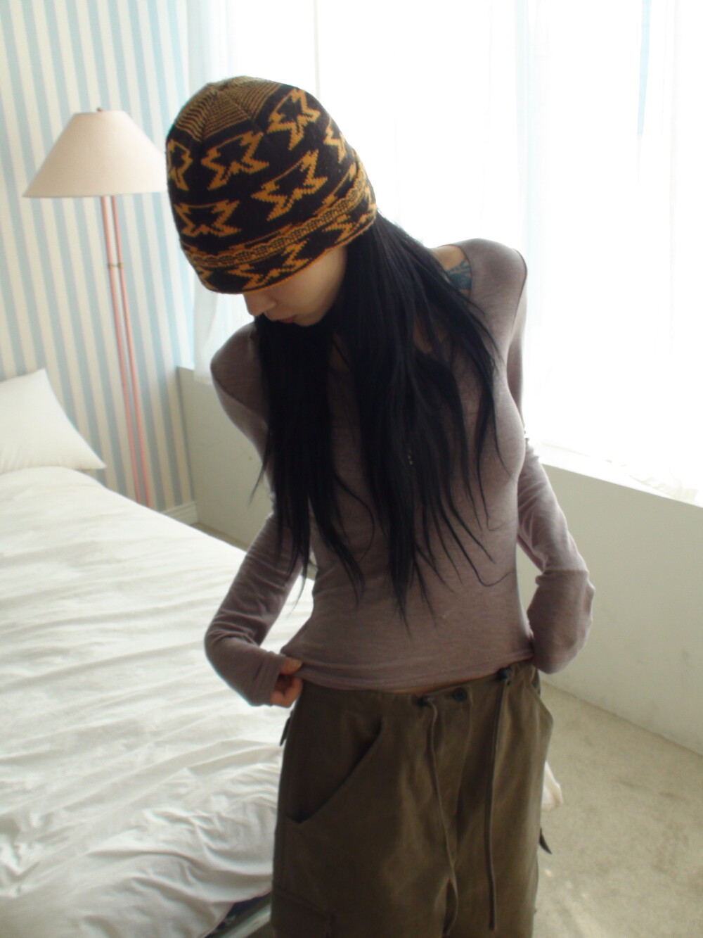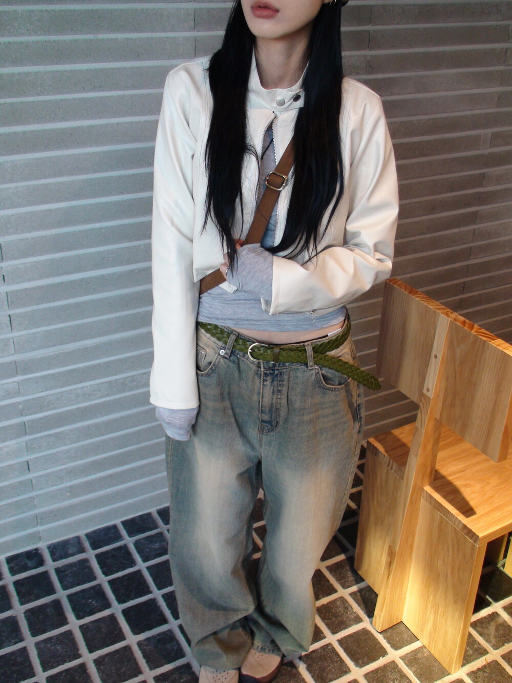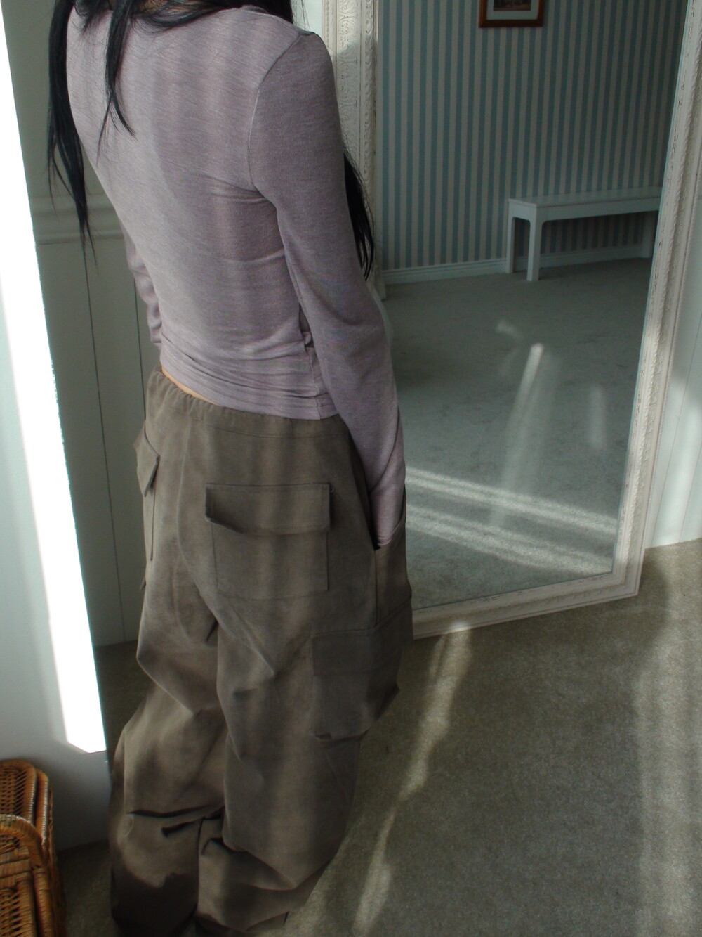 딥한 u넥 라인으로 목선과 쇄골라인을 여리하게 연출해주며, 슬림하고 롱하게 떨어지는 팔라인으로 페미닌한 실루엣을 보여줍니다.