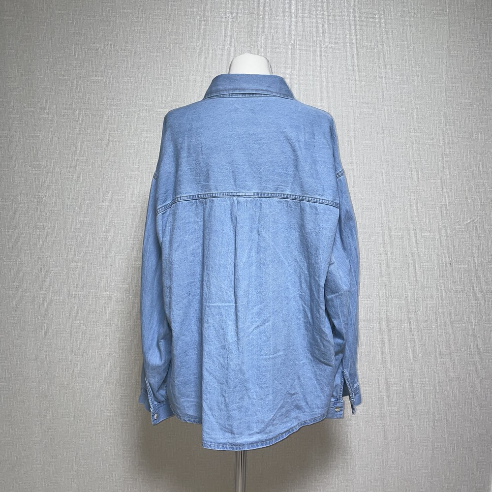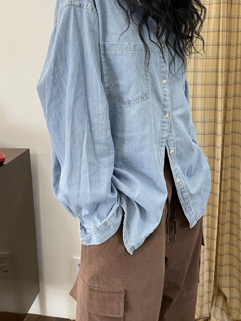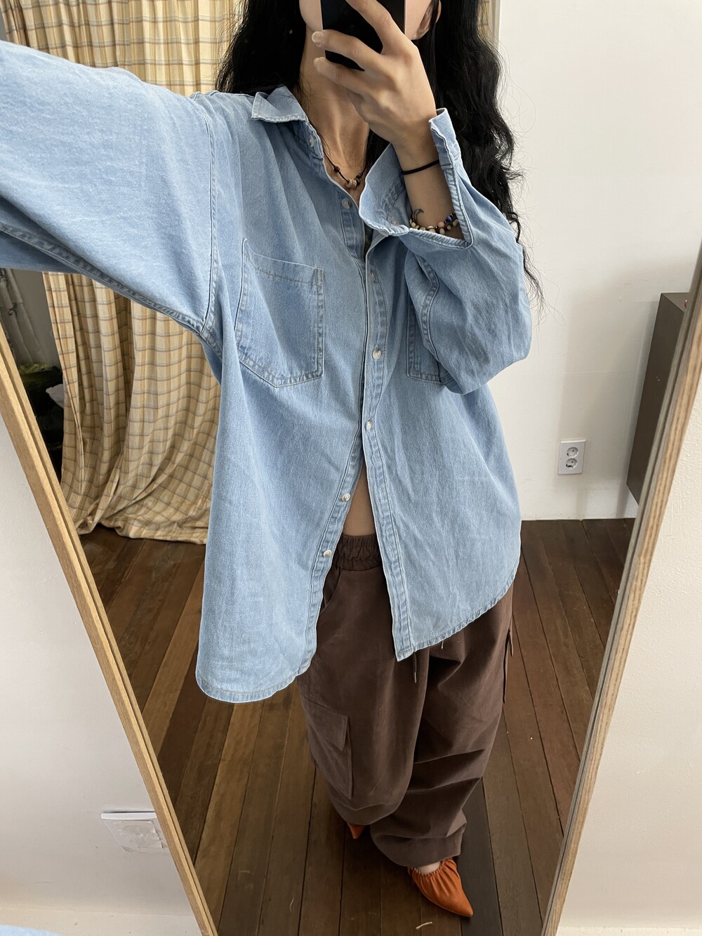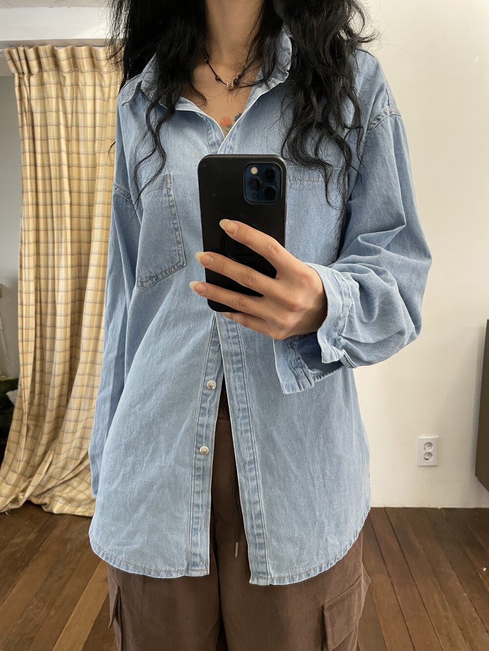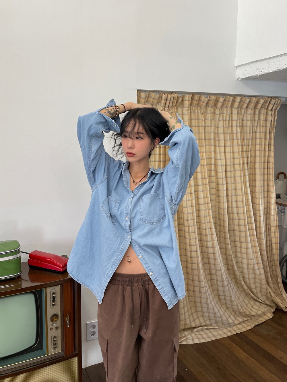 코튼100% 소재로 제작된 빈티지한 무드의 연청 데님 셔츠 제품입니다.