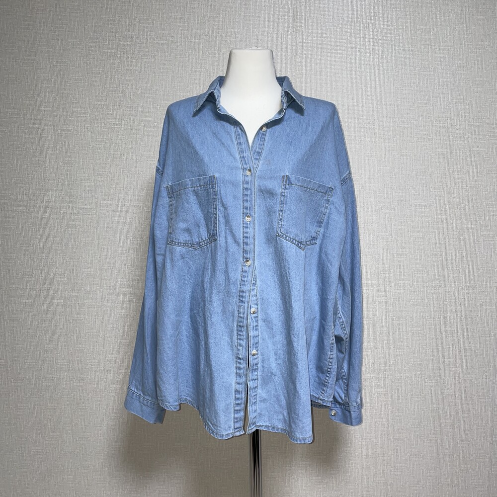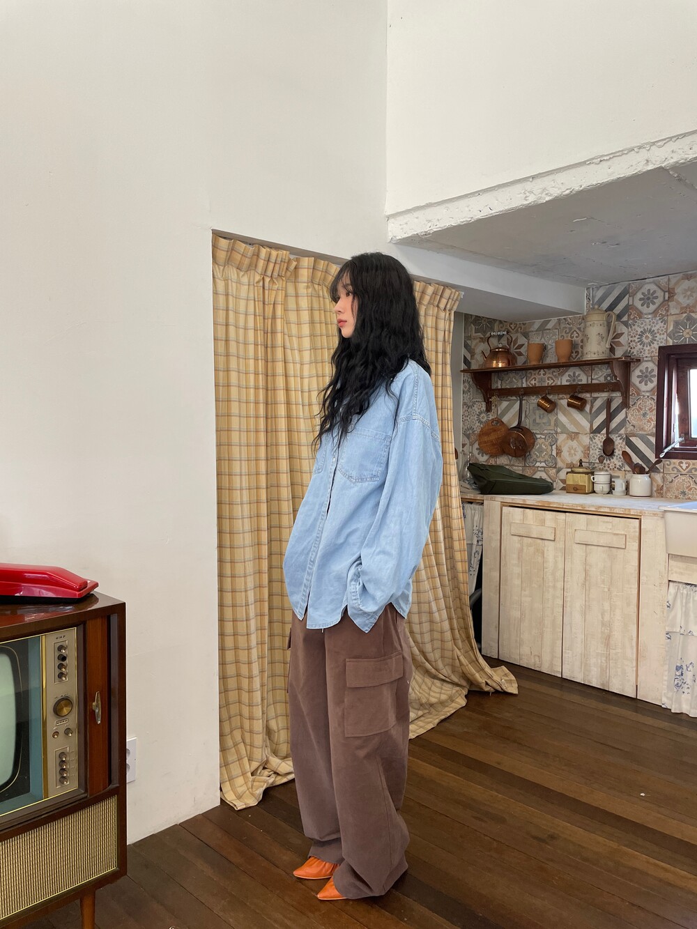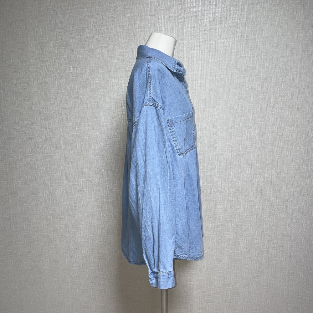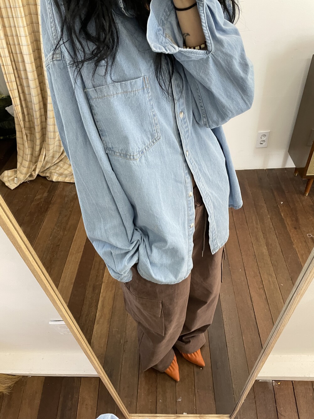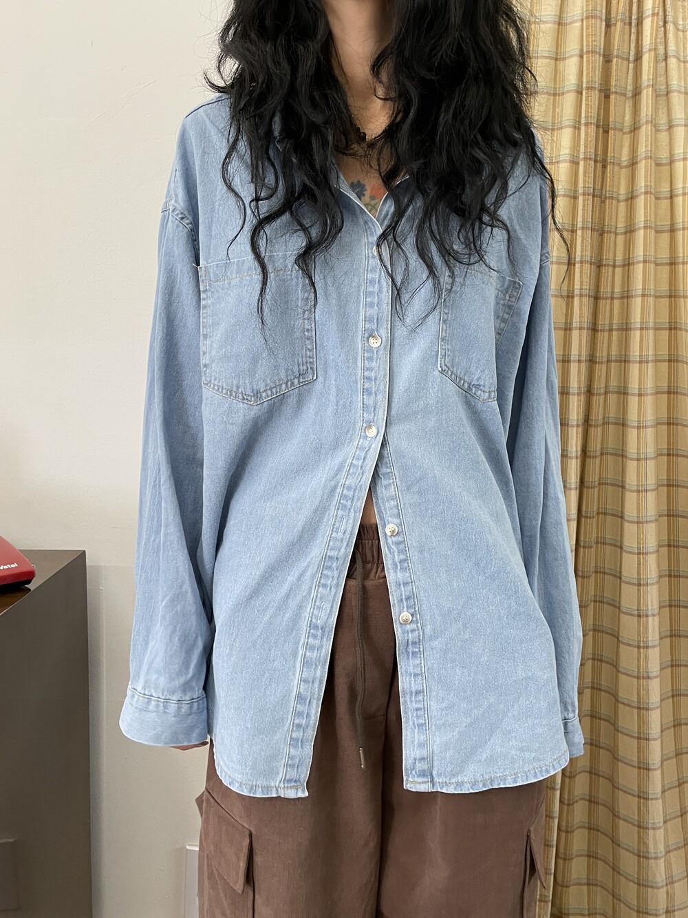 코튼100% 소재로 제작된 빈티지한 무드의 연청 데님 셔츠 제품입니다.