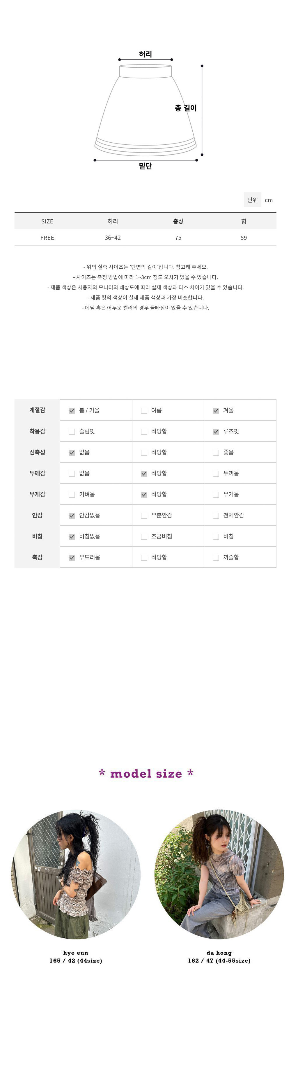 - 촬영 환경과 해상도에 따라 제품 색상이 달라보일 수 있으며, 피팅샷이 실물색상과 더 유사합니다.
